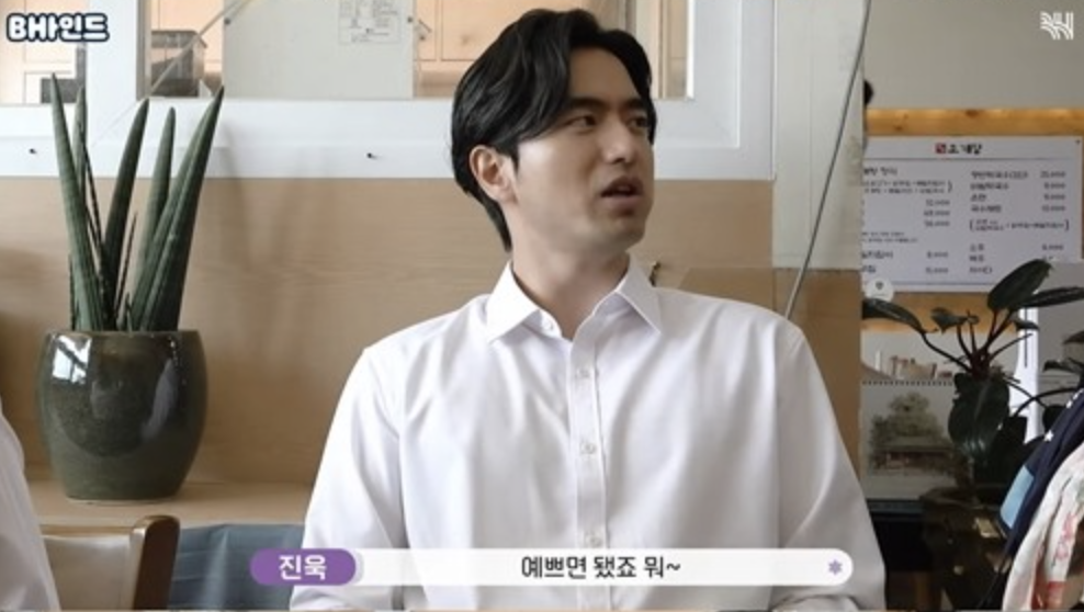 이진욱은 '예뻐서 그냥 제가 참고 살아요. 예쁘면 됐죠'라며 장난스럽게 대답하였습니다.