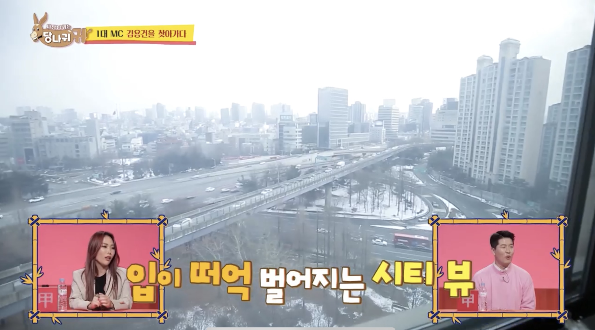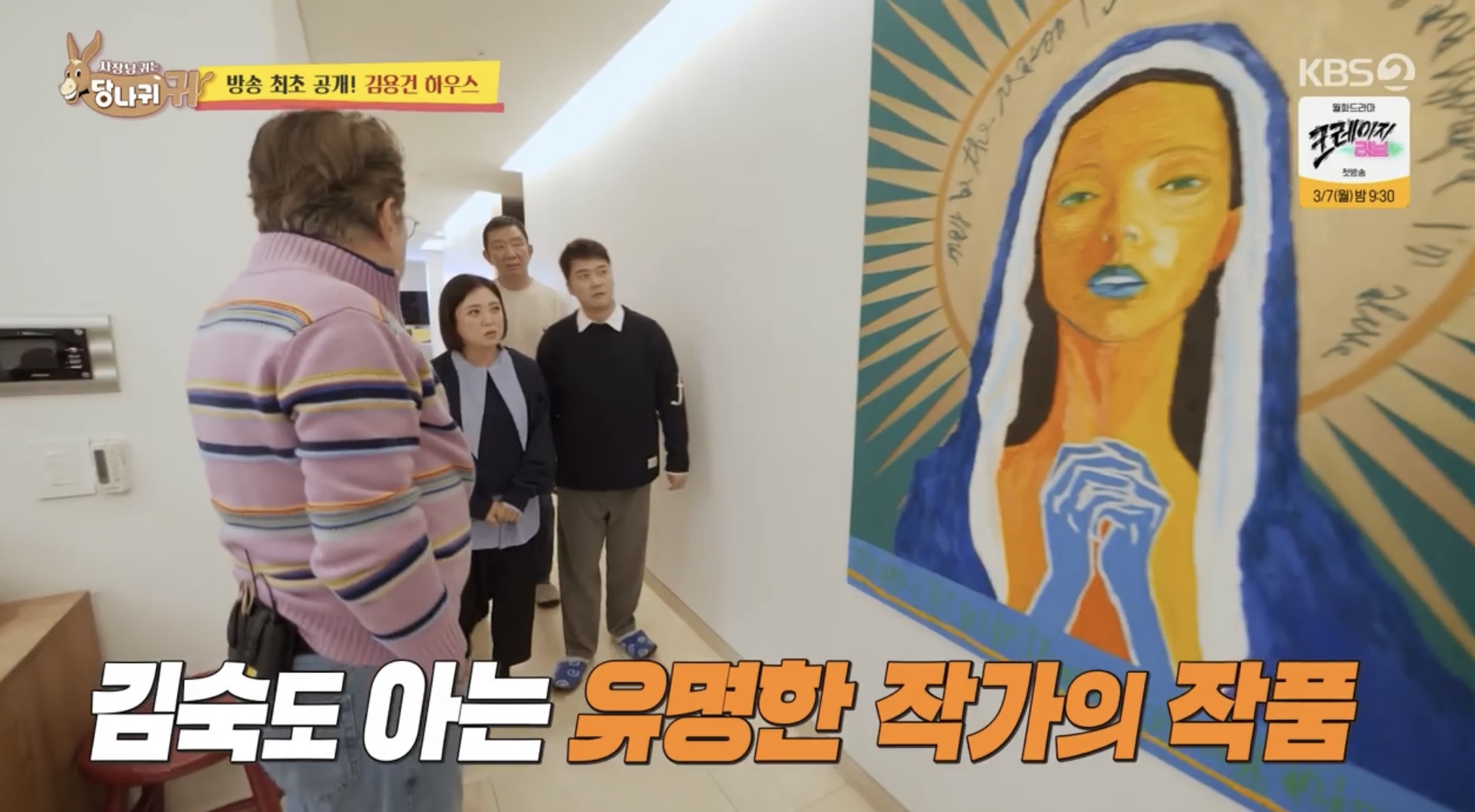 최근에 이사한 김용건의 집을 처음 방문한 전현무는 한강이 내려다 보이는 창밖 풍경에 감탄했고 김숙은 복도에 걸린 억 소리 나는 그림을 보고 눈이 휘둥그레졌습니다.