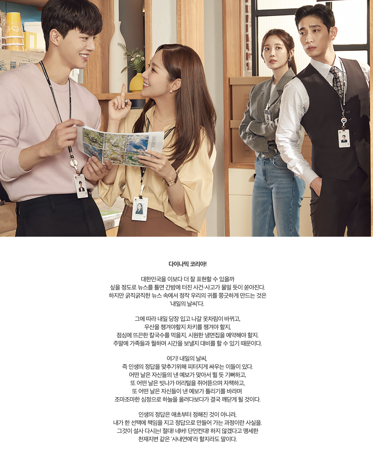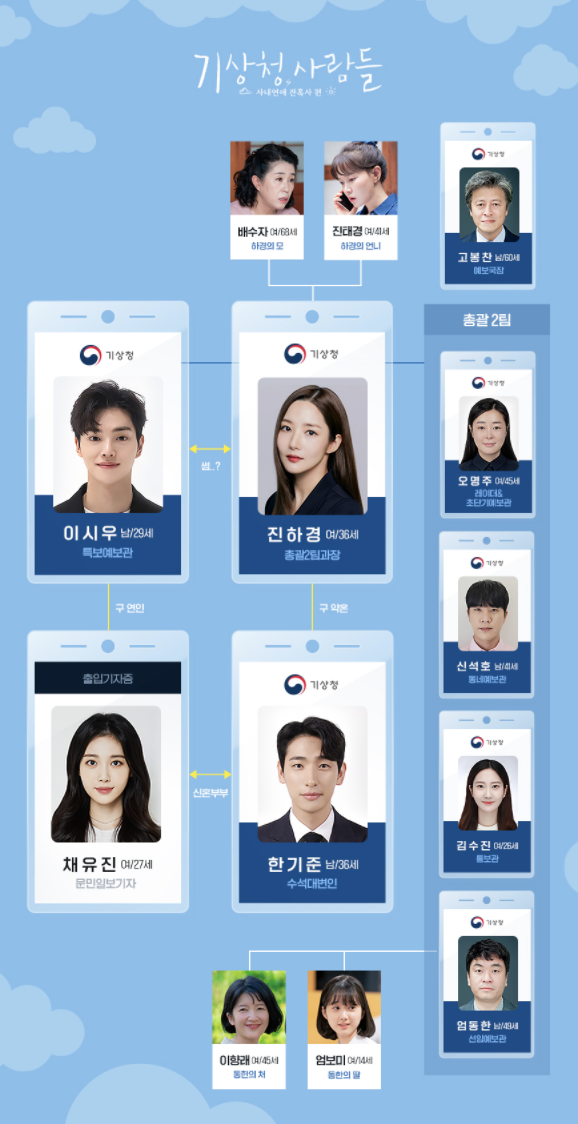 기상청 사람들은 열대야보다 뜨겁고 국지성 호우보다 종잡을 수 없는 기상청 사람들의 일과 사랑을 그린 직장 로맨스 드라마입니다.