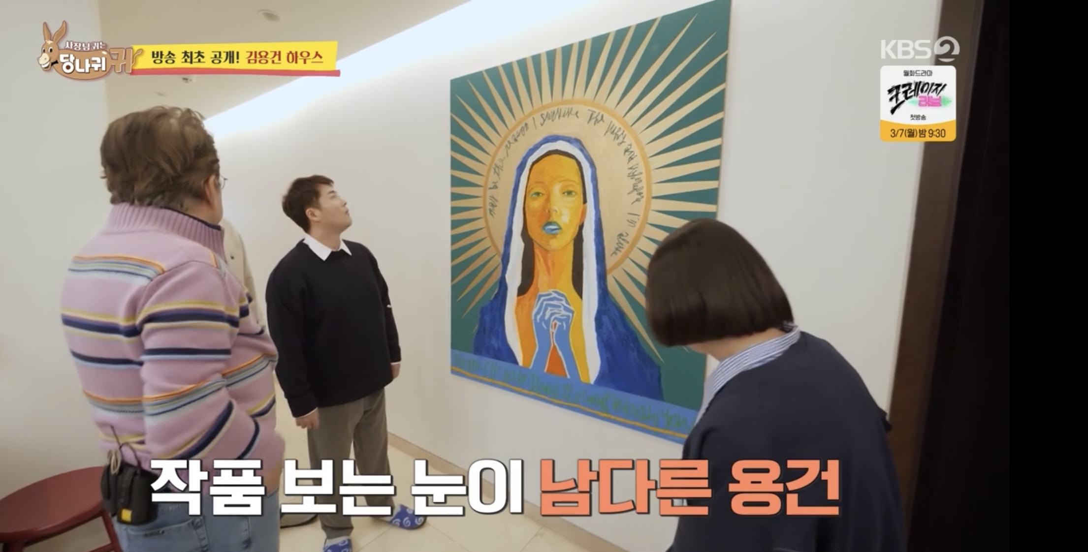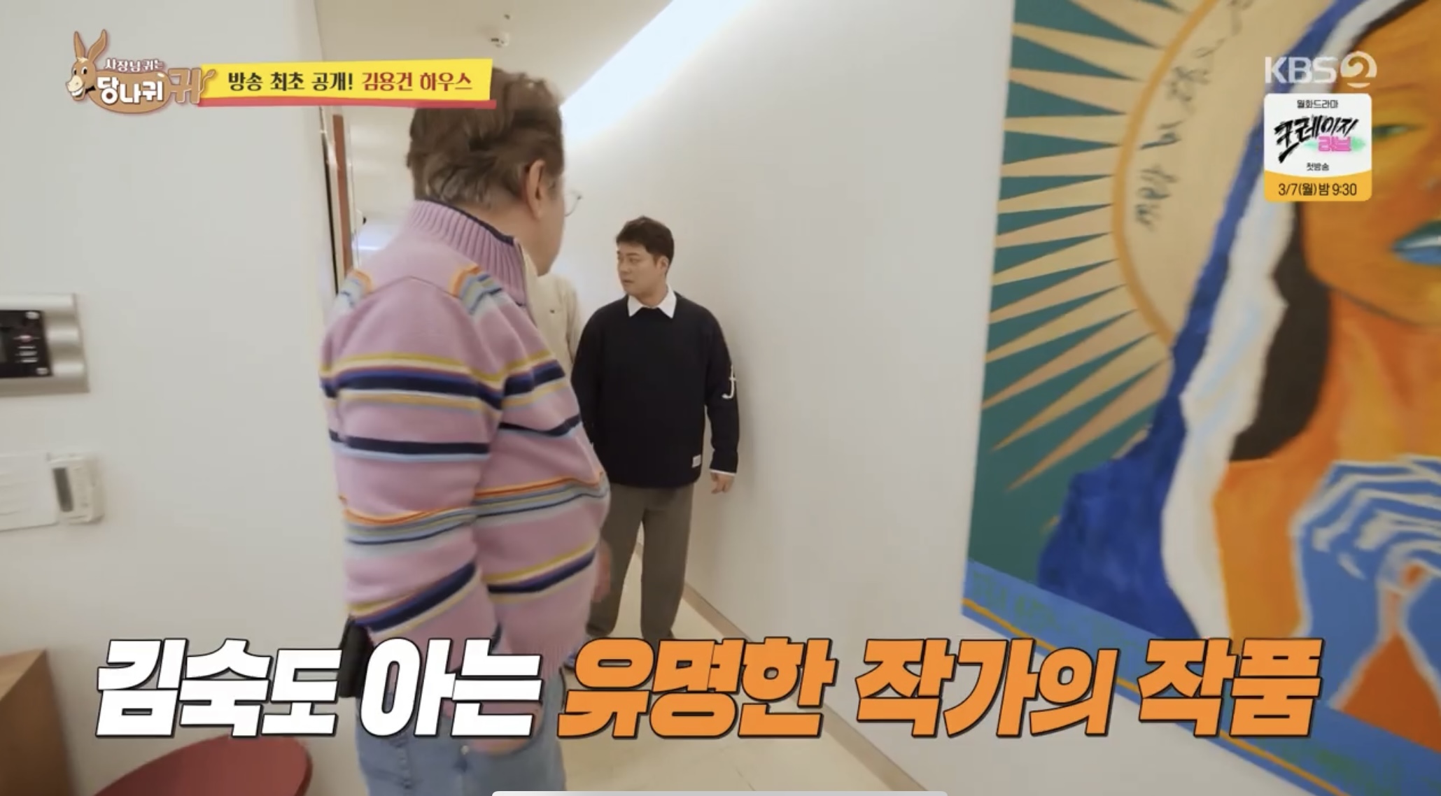 최근에 이사한 김용건의 집을 처음 방문한 전현무는 한강이 내려다 보이는 창밖 풍경에 감탄했고 김숙은 복도에 걸린 억 소리 나는 그림을 보고 눈이 휘둥그레졌습니다.