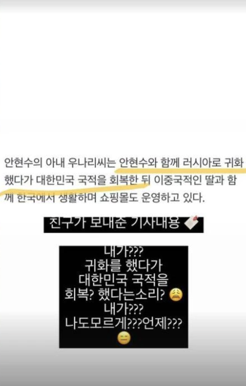 우나리는 자신의 인스타그램 스토리에 '우나리 씨는 안현수와 함께 러시아로 귀화했다가 대한민국 국적을 회복했다'는 내용의 기사를 올리고 '내가 귀화했다가 대한민국 국적을 회복했다는 소리? 내가? 나도 모르게? 언제? 라며 황당해하는 글을 올렸습니다.