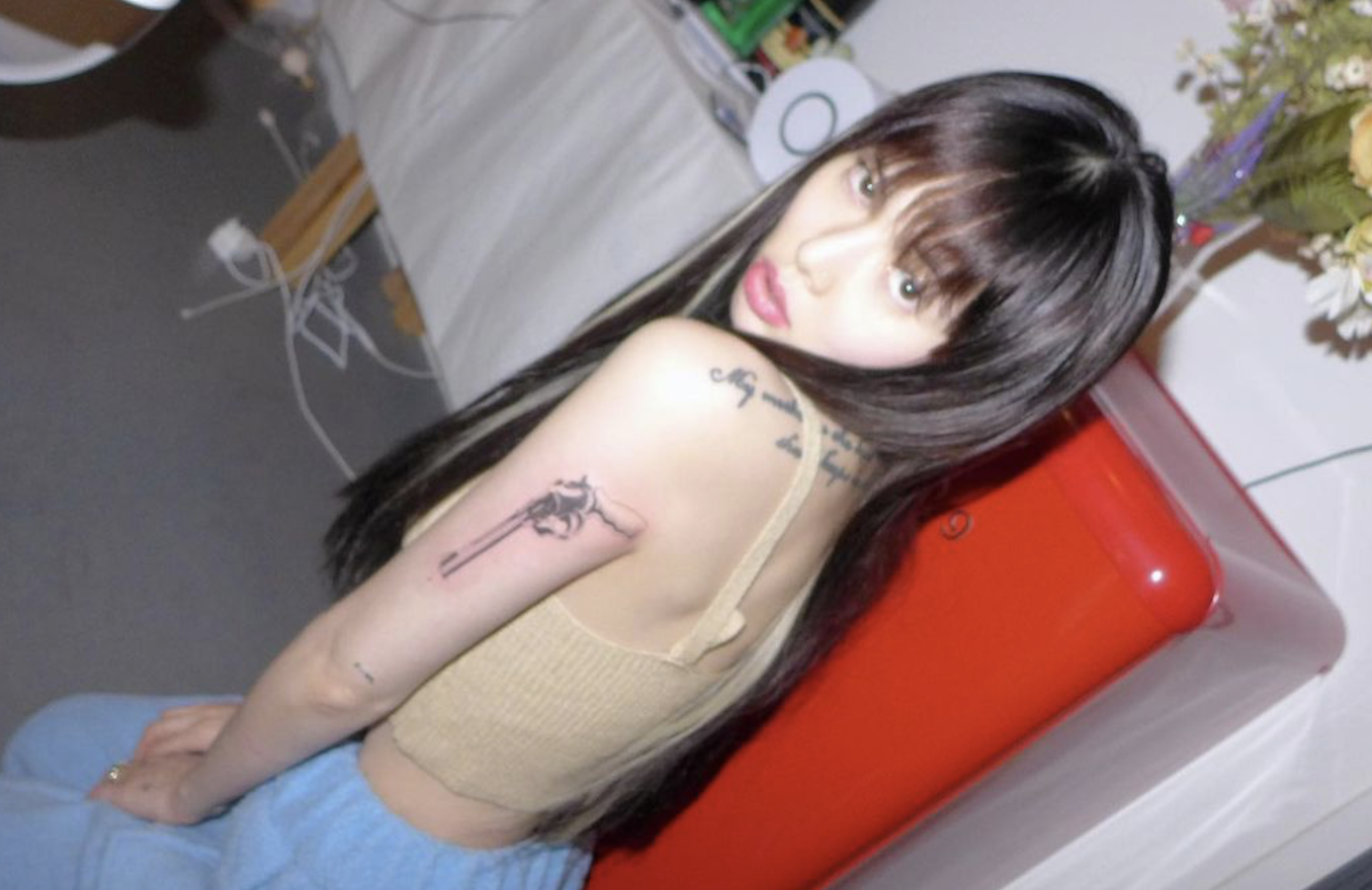 뿐만 아니라 핸드폰을 찍고 있는 손에는 'A'라는 타투도 보이며 팔에 새겨진 타투가 조금씩 보입니다.