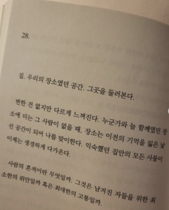 결별 의혹을 부른 오수영 작가의 '긴 작별 인사' 책 한 페이지를 찍어서 올렸습니다. '집. 우리의 장소였던 공간. 그곳을 둘러본다. 변한 건 없지만 다르게 느껴진다. 누군가와 늘 함께였던 장소에 더는 그 사람이 없을 때'라는 글이 내용이 담겼습니다.