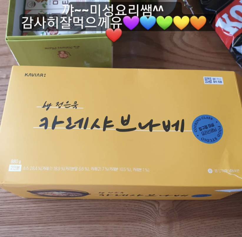 황정음은 선물받은 카레샤브나베를 인증하면서 '감사히 잘 먹으께유' 라고 감사인사를 전했습니다. 고급 초콜릿 사진과 함께 '오빠랑 내가 젤 져아하는 쪼꼬렛' 이라고 하여 관심을 집중시켰습니다.